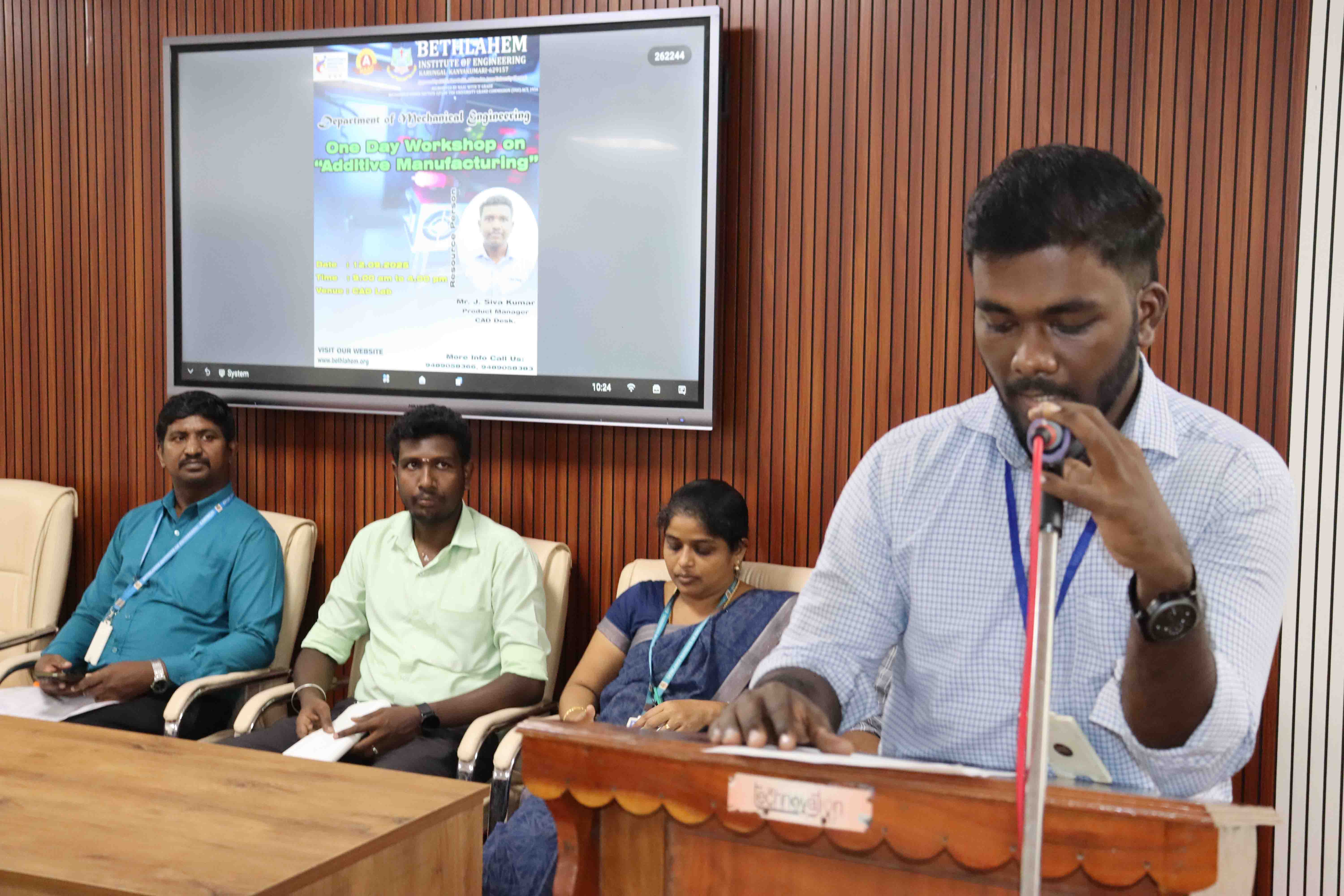 Additive Manufacturing (AM), commonly known as 3D Printing, is a transformative manufacturing technology that builds components layer by layer directly from digital models. In our Department organized the One day workshop on “Additive Manufacturing" on 12-09-2025 in CAD Lab from 09.00 AM to 04.00 PM. The Principal Dr. C. Emmy Prema, Resource Person Mr. J. Siva Kumar, Product Manager, CAD Desk, Head of The Department Mr. S. Japdrew, Programme Coordinator Mr. A. Ajish and Student Coordinator Mr. J. Berlin (IV MECH) brightened the dais. Around 43 students participated in the event. The function started with the welcome Address delivered by Mr. J. Berlin (IV MECH). The Principal of the College Dr. C. Emmy Prema gave the felicitation address. She also explained about the importance of Additive Manufacturing for Mechanical Engineering. Ms. V.S Varsha (IV MECH) introduced the Chief Guest. The Chief Guest addressed the students by indicating role of Additive Manufacturing. The session was closed after with the formal vote .